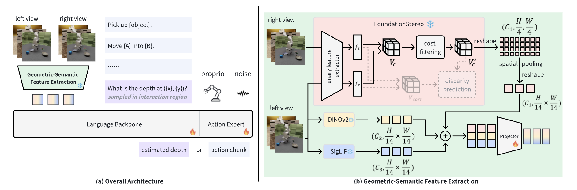 In StereoVLA, a stereo image pair is encoded by the Geometric-Semantic Feature Extraction module to generate visual tokens with geometric precision and semantic richness. Together with language tokens, they are processed by a large language model backbone (InternLM-1.8B). An action expert predicts delta end-effector poses, while an auxiliary depth estimation task further enhances geometry learning during training. The Geometric-Semantic Feature Extraction module extracts geometric features with FoundationStereo (bypassing disparity prediction components for efficiency) and semantic-rich features with SigLIP and DINOv2, then fuses them into a unified visual representation with an MLP projector.