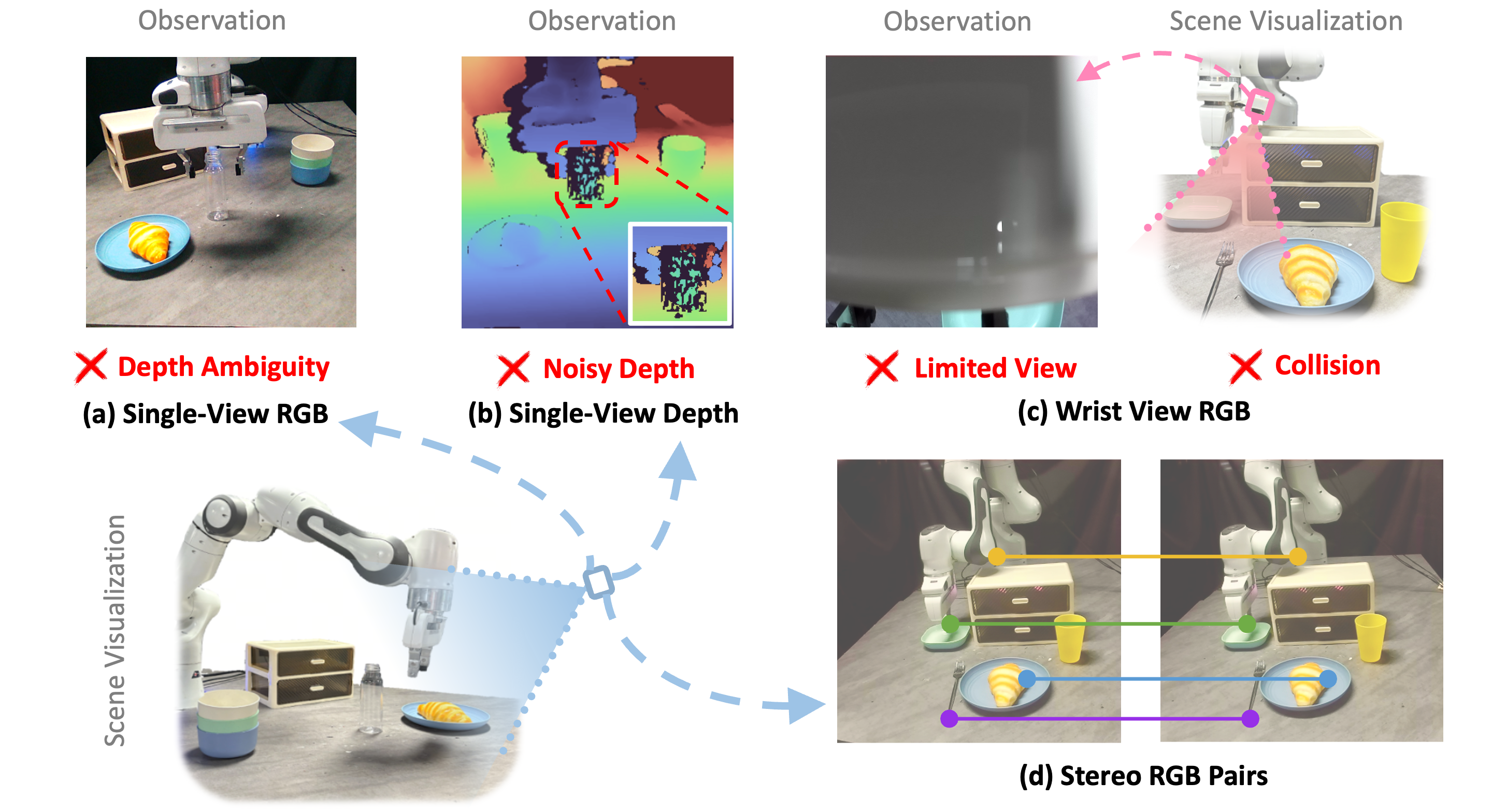 StereoVLA leverages stereo geometric cues to achieve precise spatial perception, enabling manipulation of thin and small objects.